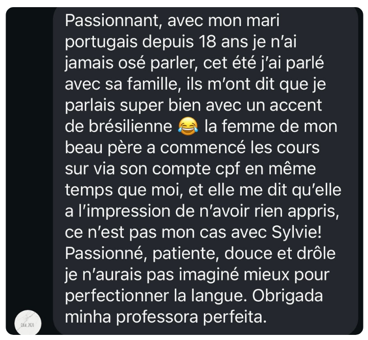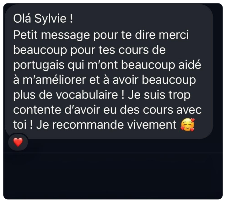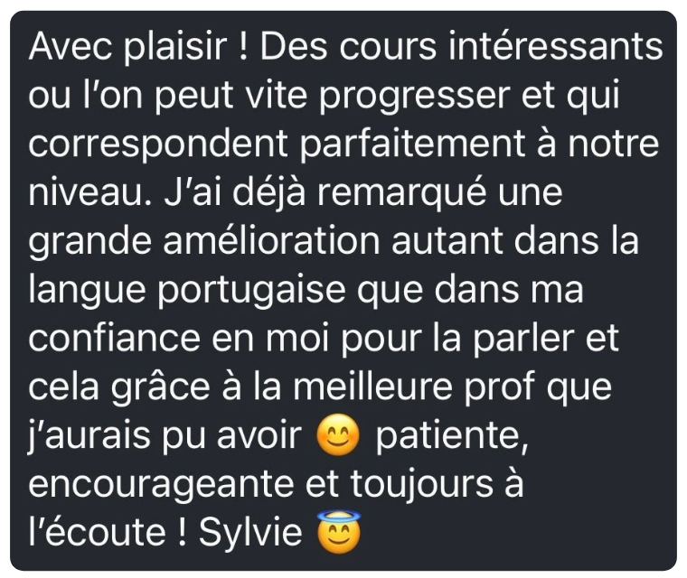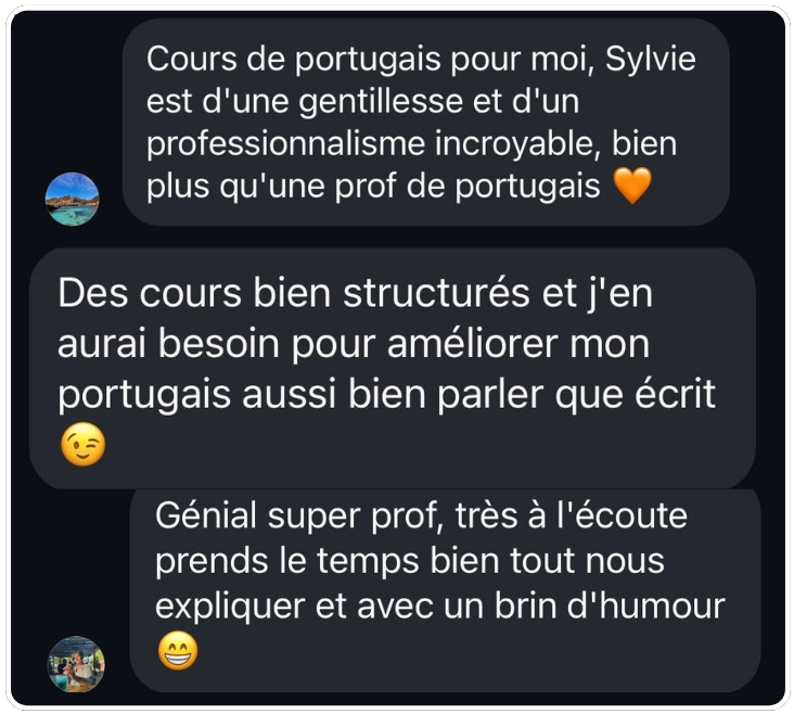 GrĂące Ă mon parcours franco-portugais, je comprends parfaitement les erreurs frĂ©quentes que les francophones peuvent faire en apprenant le portugais ainsi que les dĂ©fis quâils rencontrent. Qui plus est, comme je vis Ă Lisbonne depuis plus de 20 ans, jâenseigne un portugais authentique, celui que lâon parle rĂ©ellement au quotidien, loin du langage parfois trop formel des manuels scolaires. Je connais tous les trucs et toutes les astuces pour vous aider Ă maĂźtriser le portugais tel quâil est utilisĂ© dans la vie de tous les jours.